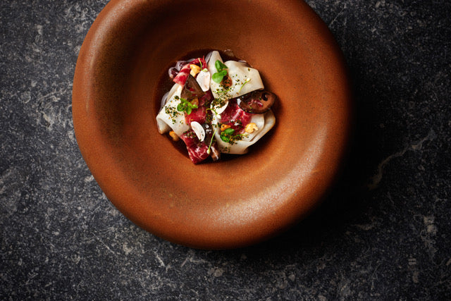 Beef fillet with smoked celery, woodland mushrooms, walnut and wild herbs